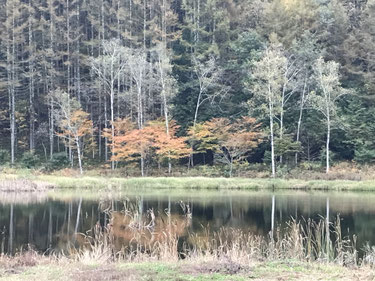 大きな紅葉する樹木は無い場所ですが、水際の楓がわずかにいろづいてきました。