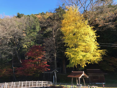 左の桂の樹が色づきました、この樹が落葉すると隣の楓と銀杏が見ごろになってきます。