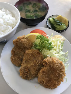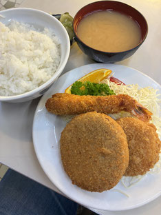 メンチカツ・カニ(クリーム)コロッケ・エビフライが乗った定食です(それぞれ単体での定食も有ります)。